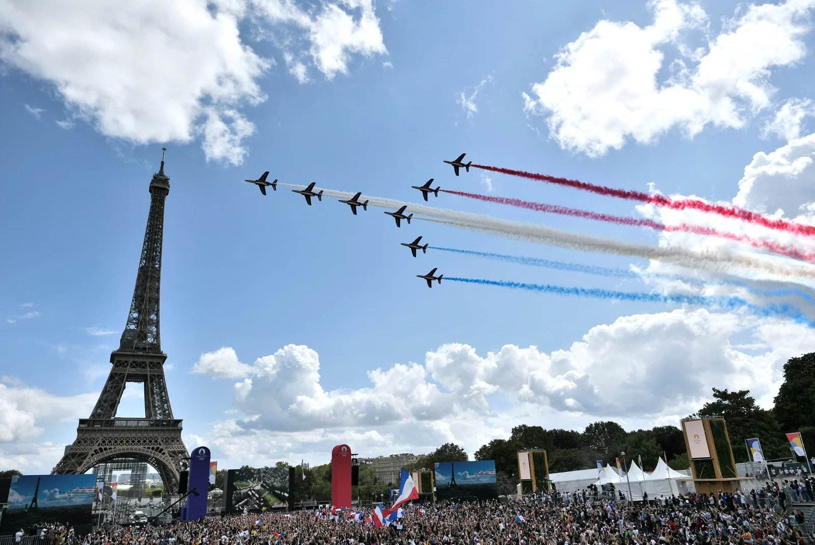 It was also a stark contrast to the far more festive park scene that unfolded in Paris, where tens of thousands of sports fans waving the tricolour flag thronged into a fan zone across the river from the Eiffel Tower as Paris prepared to take over the Olympic baton from Tokyo for the 2024 Summer Games.