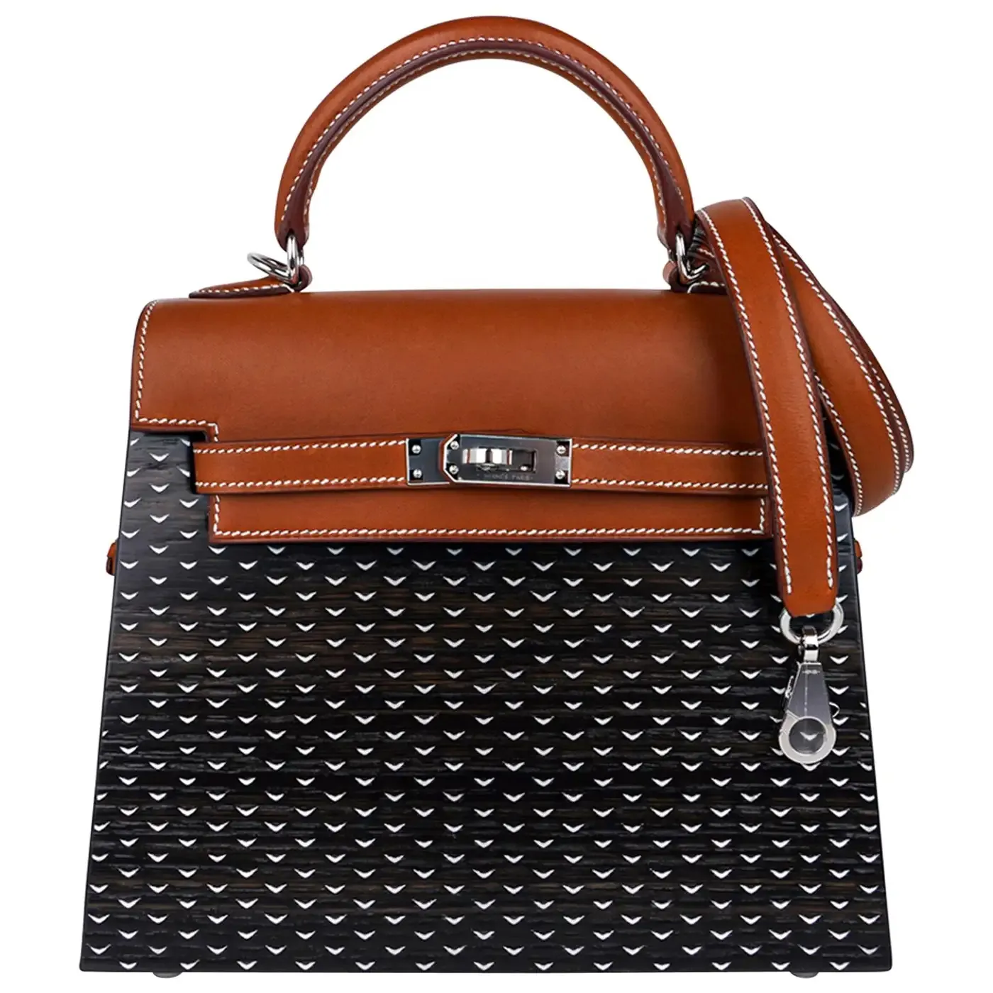 The most costly of the two limited-edition 22-inch Kellywood models that Hermès unveiled in 2020 was the one made of bog oak and Barenia leather. This handbag has a unique herringbone pattern thanks to tiny metal strips that have been placed into its wooden body. This natural wood and Fauve barenia leather bag with platinum hardware. A barenia leather front flap, white contrast stitching, two center toggle straps, a rolled handle, and a removable strap are included.